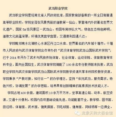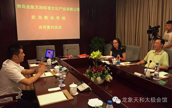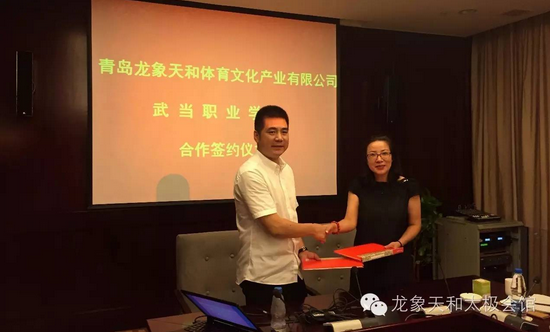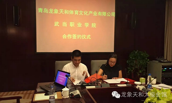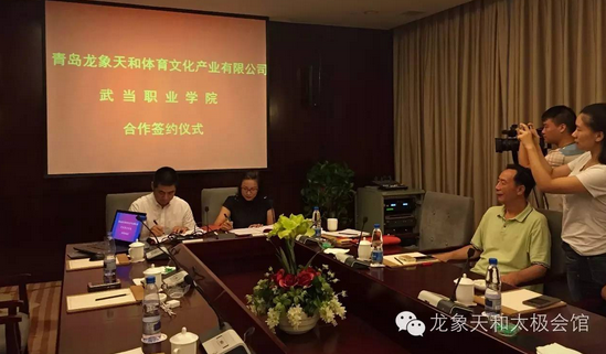 昨日,太极文化体育产业领航者-龙象天和与武当职业学院正式签署合作协议,双方将着力打造龙象天和太极学院。龙象天和刘加巍董事长、苏争总经理,武当山国际武术学院(武当职业学院)王茂国董事长、祝三梅副董事长出席了签约仪式。
